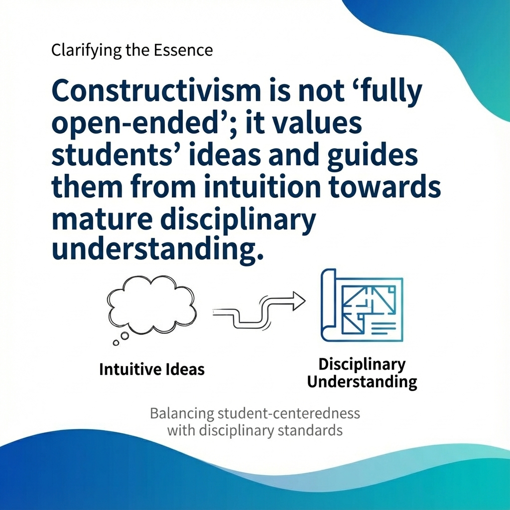 • Different Perspectives: Constructivism itself encompasses multiple perspectives, including focusing on individual ideas, concentrating on social interaction in the classroom, or emphasizing socio-cultural contexts (such as viewing students as apprentices in disciplinary cultural practices). Teachers need to integrate all these facets.