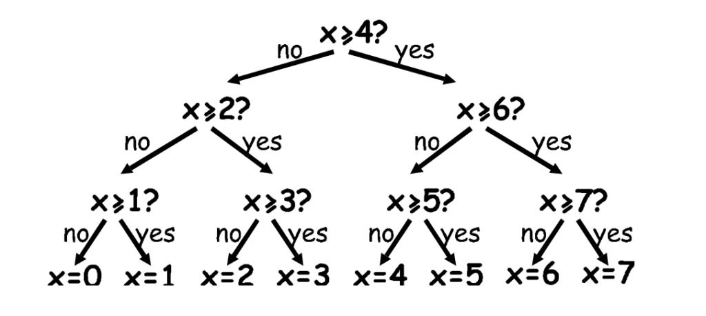 - 老師:「剛剛我們玩猜數字,你腦袋裡是怎麼想的?能不能把你的『思考路線』畫出來給別人看?這次換範圍小一點的 0 ~ 7 來猜,如果你第一句問『是不是大於等於 4?』,接下來你會怎麼走?」